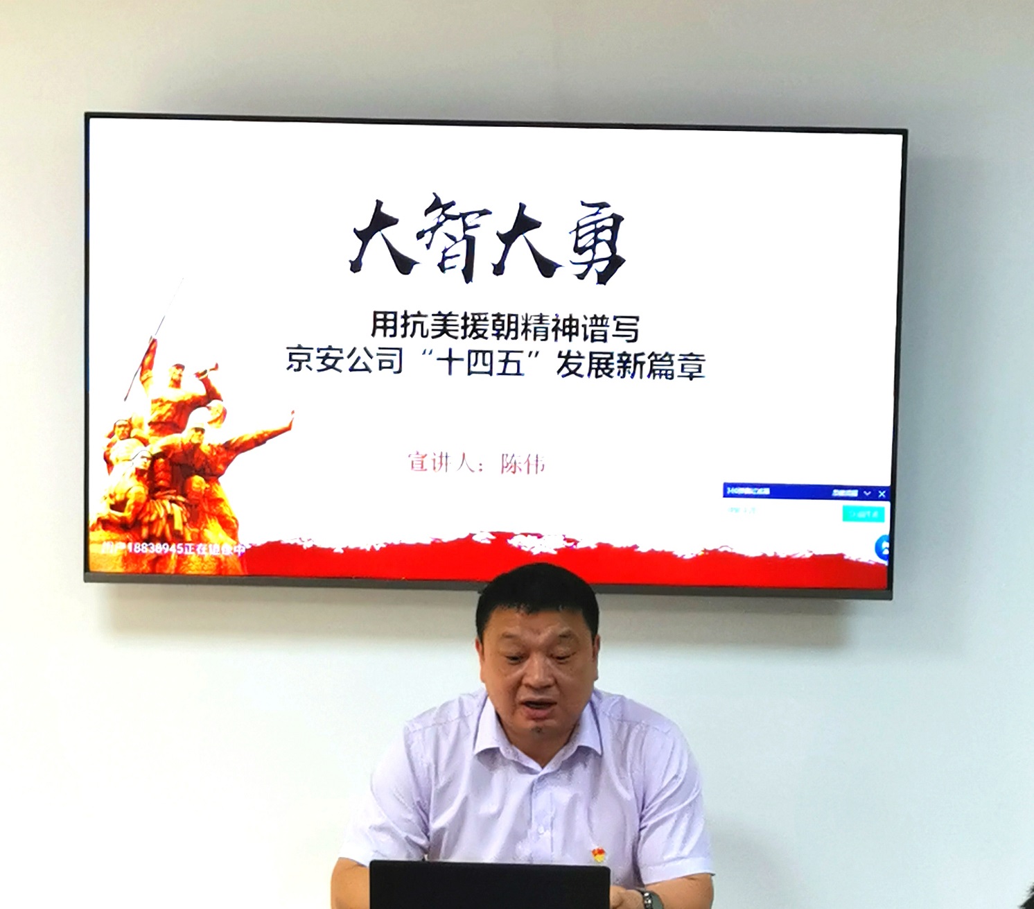 陈伟同志在题为大智大勇 用抗美援朝精神谱写京安公司十四五发展新篇章》的党课回顾了上世纪50年代中国人民志愿军在客观条件十分艰苦情况下,不畏强敌藐视困难,大智大勇,夺取胜利的伟大历史。提出大智大勇、敢于胜利不仅是志愿军的军魂,同样也应该是京安的企业之,要用这种精气神去克服前进中的困难挑战,奋力完成年度重点工作