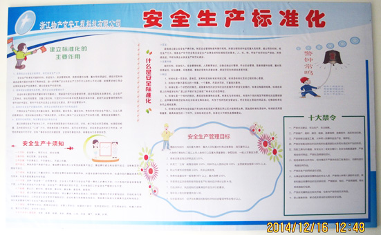 在物产民爆总公司的统一部署下,公司自2013年年中着手开展安全生产标准化创建工作,广泛进行安全生产标准化创建宣传教育。2013年6月9日,公司成立了以总经理为组长的安全生产标准化创建领导小组,明确了相关人员的工作职责,以文件形式下发给部门、车间,并在安全生产标准化创建全员会议上予以宣贯。