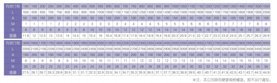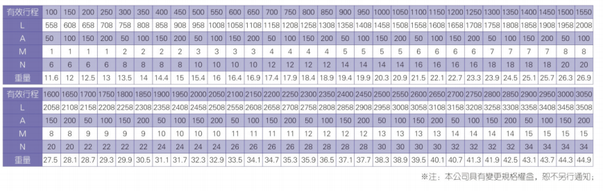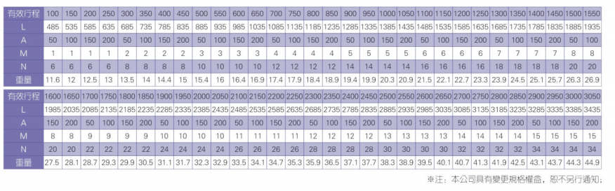2、螺杆转速超过临界转速时可能发生共振,临界转速和螺杆长度有关,故滚珠螺杆的临界转速也间接决定了滑台模组的有效行程和总长度,有效行程和常用螺杆规格转速的关系如下列表格。