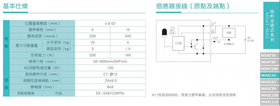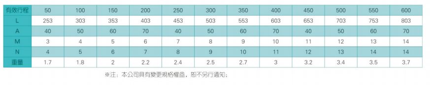 2、螺杆转速超过临界转速时可能发生共振,临界转速和螺杆长度有关,故滚珠螺杆的临界转速也间接决定了滑台模组的有效行程和总长度,有效行程和常用螺杆规格转速的关系如下列表格。